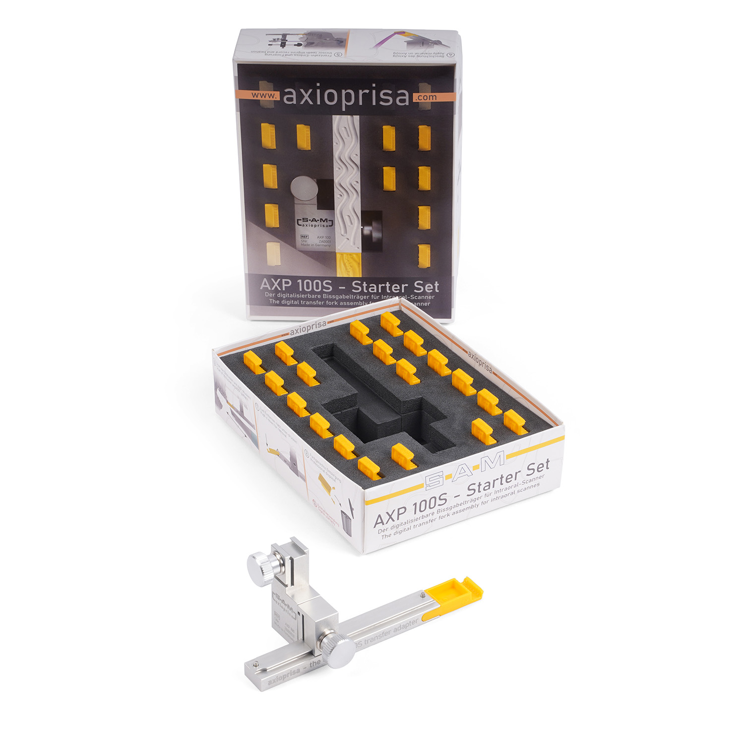 Сборка переноса Axioprisa прикреплена к переносной дуге SAM обычным способом. Благодаря комбинации Axioprisa и переносной дуги можно сканировать верхнюю челюсть в правильном анатомическом положении. Франкфуртская горизонталь — это плоскость, используемая всеми артикуляторами SAM. Используя этот путь, можно переносить положение челюсти с дополнительным сканированием во время внутриротового сканирования. Путь к простым процессам в стоматологической практике позволяет свести источники ошибок к минимуму.