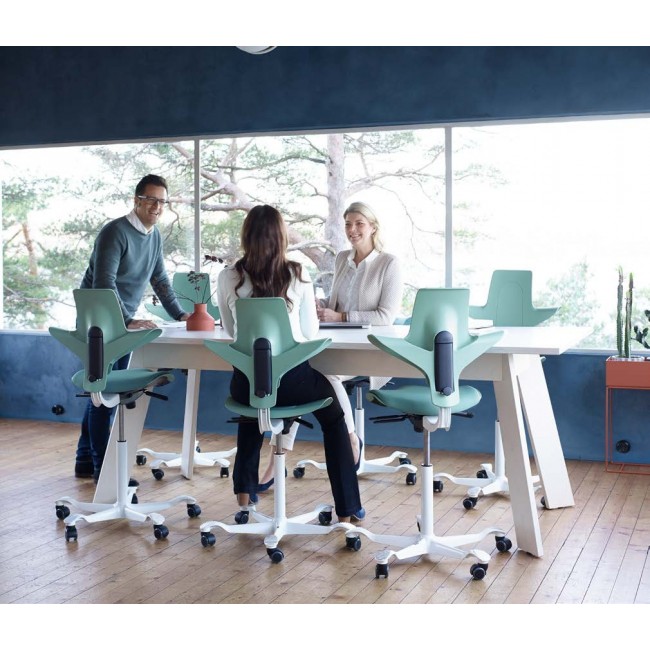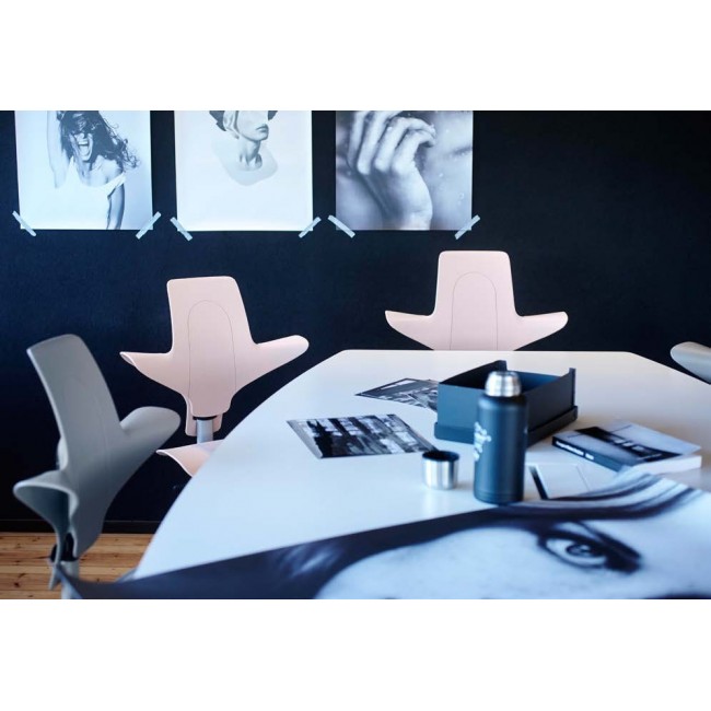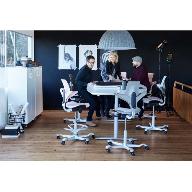 HAG Capisco Puls 8010 - это пластиковый стул с сиденьем и спинкой. Сиденье имеет встроенную подушку. Седло регулируется по высоте, вплоть до положения стоя. Угол наклона и высоту спинки также можно отрегулировать.