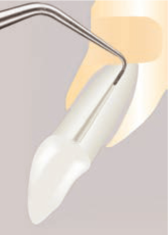 Рабочая часть насадки расположена на её кончике, это последние 2 – 3 мм. Кончик насадки (рабочую часть насадки), следует располагать соосно продольной оси зуба. Насадкой, не погружая её сразу в десневую борозду, необходимо пройти по периметру зуба, убирая доступные для обзора наддесневые (или поддесневые) отложения, без чрезмерного латерального давления. Начинайте работу с лицевой стороны зуба перемещаясь к мезиальному или дистальному краю.