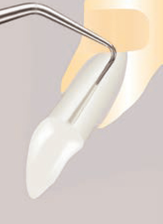 Рабочая часть насадки расположена на её кончике, это последние 2 – 3 мм. Кончик насадки (рабочую часть насадки), следует располагать соосно продольной оси зуба. Насадкой, не погружая её сразу в десневую борозду, необходимо пройти по периметру зуба, убирая доступные для обзора наддесневые (или поддесневые) отложения, без чрезмерного латерального давления. Начинайте работу с лицевой стороны зуба перемещаясь к мезиальному или дистальному краю.