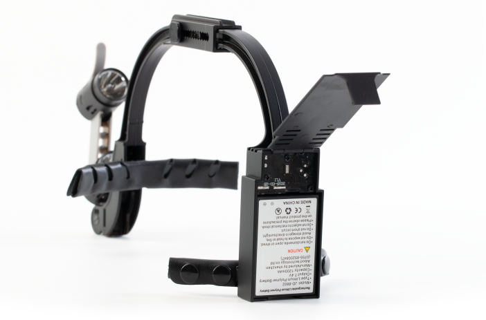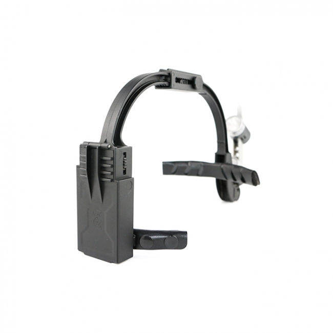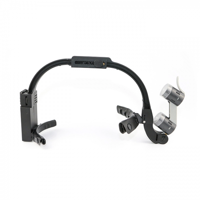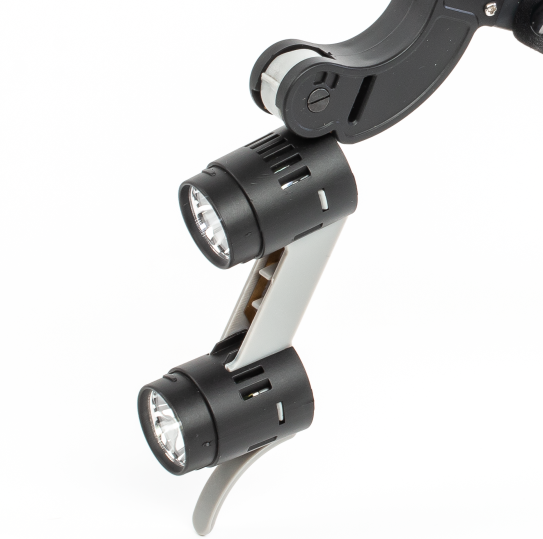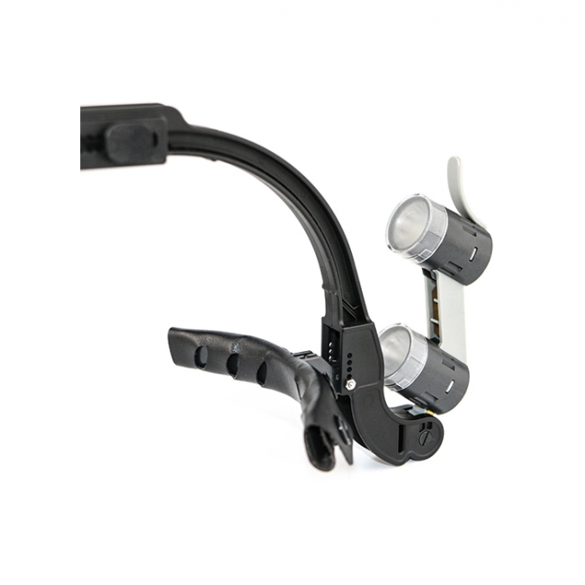 Легкая прочная пластиковая дуга весом всего 110 гр. имеет двух-точечное крепление на голове и ряд дополнительных регулировок для удобства посадки. Два мощных LED источника света с регулируемой яркостью до 90000 Lx создают бестеневое рабочее поле. Цветовая температура 5000 К приближена к дневному свету для комфортной длительной работы. Включение и выключение осветителя происходит за счет перемещения блока осветителей в крайнее нижнее и верхнее положение соответственно. Быстрая замена аккумулятора в затылочной части осветителя обеспечит непрерывную работу в течение всего рабочего дня. Продуманная до мелочей система крепления оптических элементов позволяет их менять легко и быстро. При отсутствии необходимости в осветителе достаточно просто перевести его в верхнее положение открыв лицо. В комплектацию входит 3 набора светофильтров.