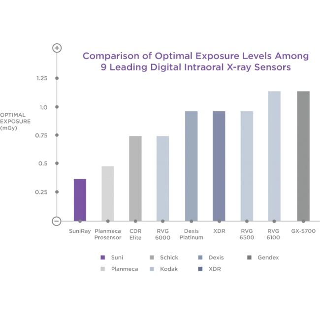 • Датчики SuniRay обладают самой высокой чувствительностью на рынке цифровых сенсоров и настроены так, чтобы без ущерба для качества снимка, сделать его при минимальной степени излучения.