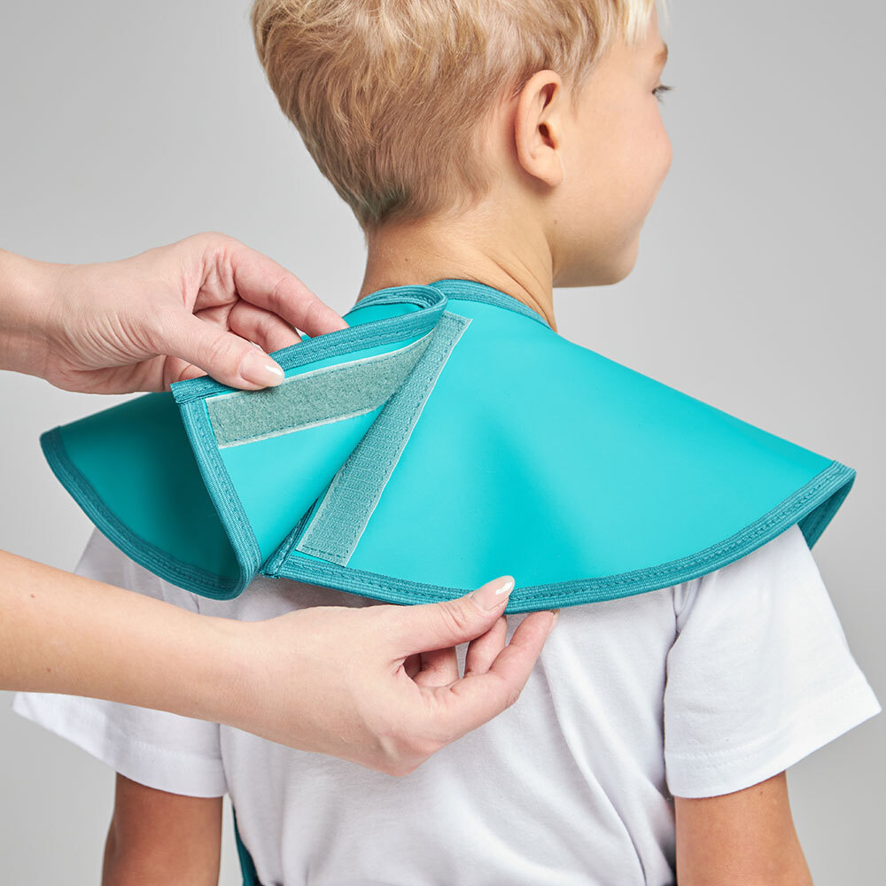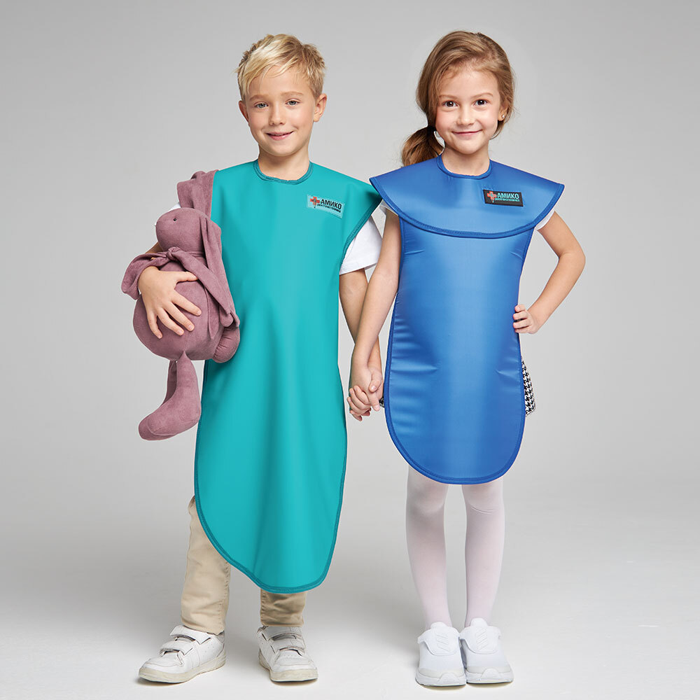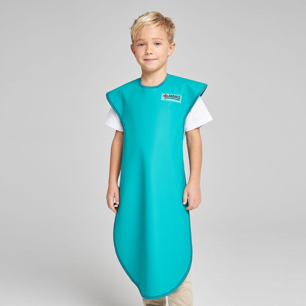 Фартук односторонний защищает тело ребёнка спереди, включая плечевой пояс, от области горла до голеней. Рекомендуется применять при снимках зубов, головы и конечностей в комплексе с воротником для дополнительной защиты щитовидной железа.