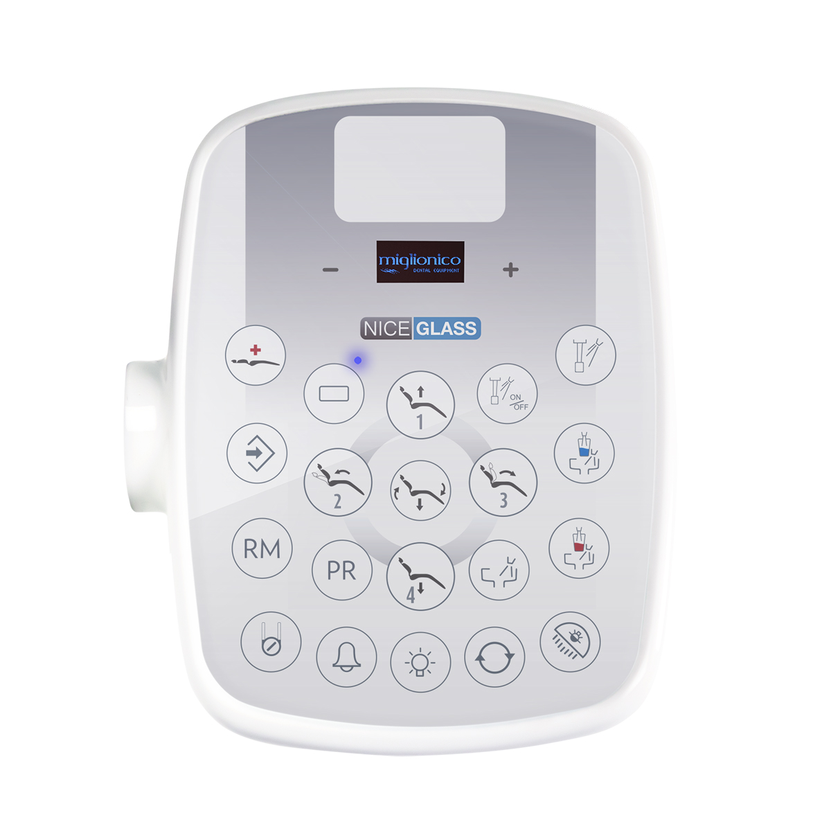 - Многофункциональная клавиатура со стеклянной поверхностью и дисплеем (управление креслом, регулировка мощности скалера, контроль оборотов микромотора, программирование времени подачи холодной/горячей воды в стакан пациента, включение/выключение светильника, реверса оборотов микромотора).