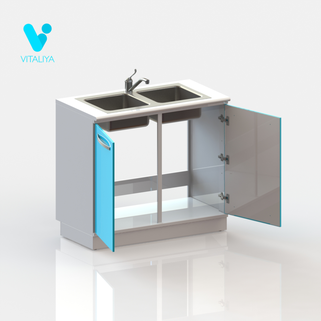 Тумба с двумя дверцами, с вырезом в задней стенке для подвода коммуникаций, оснащена двухчашевой мойкой из нержавеющей стали, локтевым смесителем, сифоном.