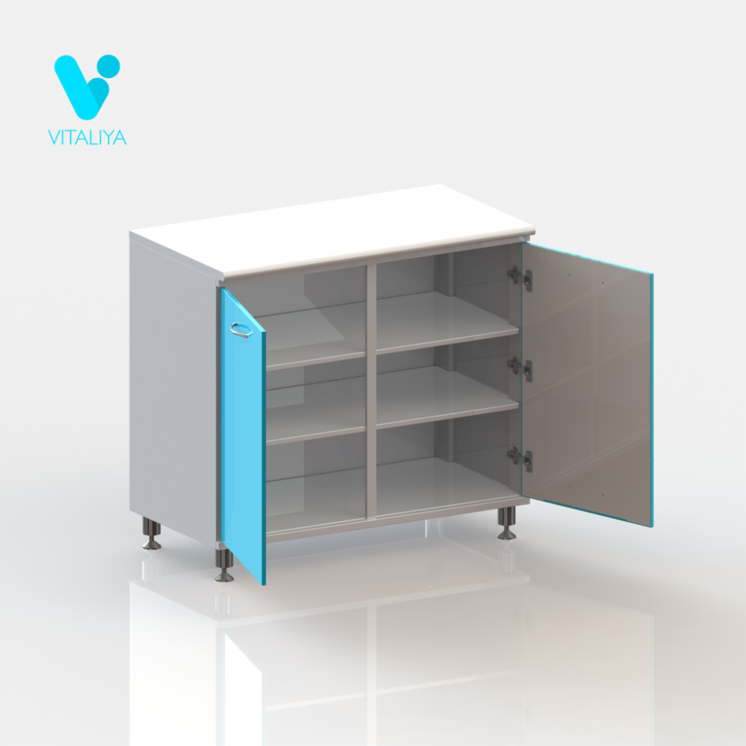 Тумба металлическая цельносварная, выполнена из листового металла толщиной 1 мм и окрашена полимерно-порошковой краской. Двери установлены на петли с механизмом плавного закрывания, укомплектованы ручкой-скобой хромированной с межцентровым расстоянием 128 мм. Тумба изготовлена в варианте на регулируемых хромированных опорах высотой 100 мм. Внутри установлены две съёмные полки