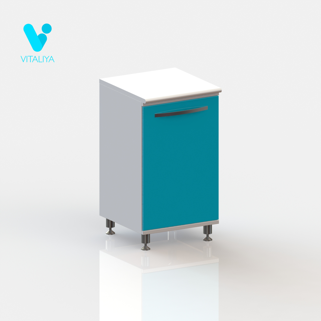 Тумба металлическая цельносварная, выполнена из листового металла толщиной 1 мм и окрашена полимерно-порошковой краской. Дверь установлена на петли с механизмом плавного закрывания, производства компании HETTICH, Германия. Фасад двери укомплектован ручкой-скобой из нержавеющей стали с межцентровым расстоянием 320 мм. Тумба изготовлена в варианте на регулируемых хромированных опорах высотой 100 мм. Внутри установлены две съёмные полки.