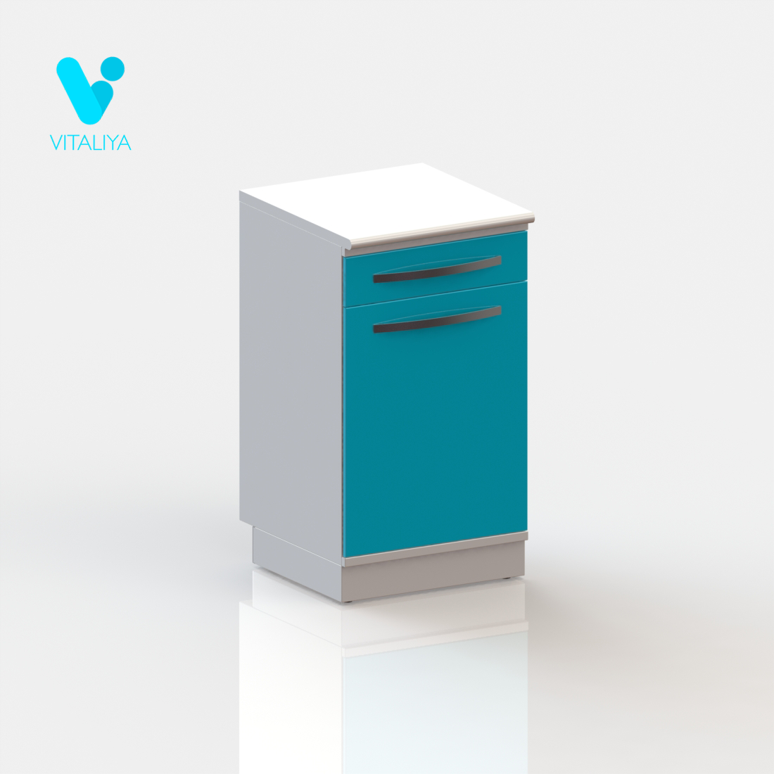 Тумба металлическая цельносварная, выполнена из листового металла толщиной 1 мм и окрашена полимерно-порошковой краской. В тумбе установлен ящик на шариковые направляющие скрытого монтажа с доводчиками, производства компании HETTICH, Германия, а так же съёмная полка. Дверь установлена на петли с механизмом плавного закрывания, производства компании HETTICH, Германия. Фасады укомплектованы ручкой-скобой из нержавеющей стали с межцентровым расстоянием 320 мм. Тумба изготовлена в варианте на подиуме высотой 100 мм с регулируемыми опорами.