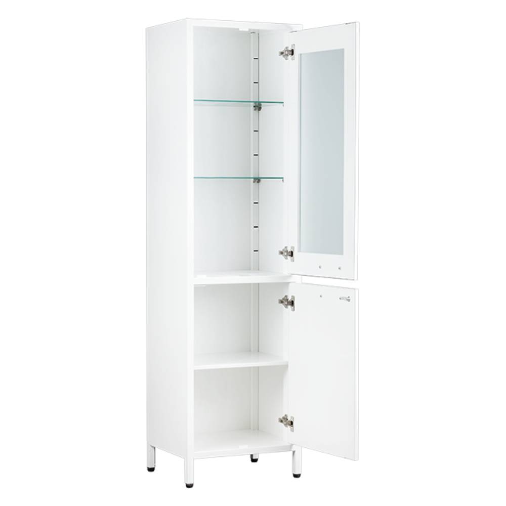 Дверь нижней — метал. с замком. Верхняя секция с 2 регулируемыми полками из металла или стекла, нижняя с 1 метал. полкой.