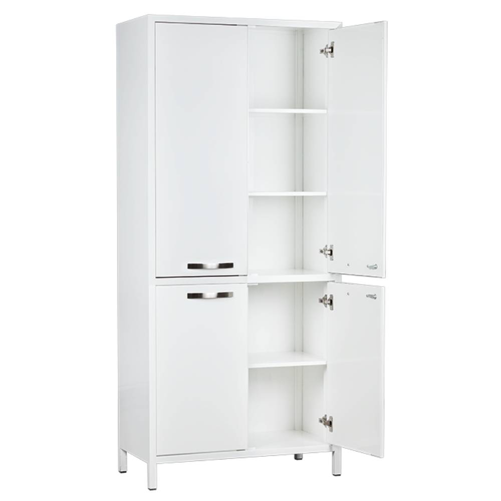 Двухстворчатый двухсекционный. Двери из металла. Верхняя секция с двумя регулируемыми полками из металла или стекла. Нижняя — с 1 полкой из металла.