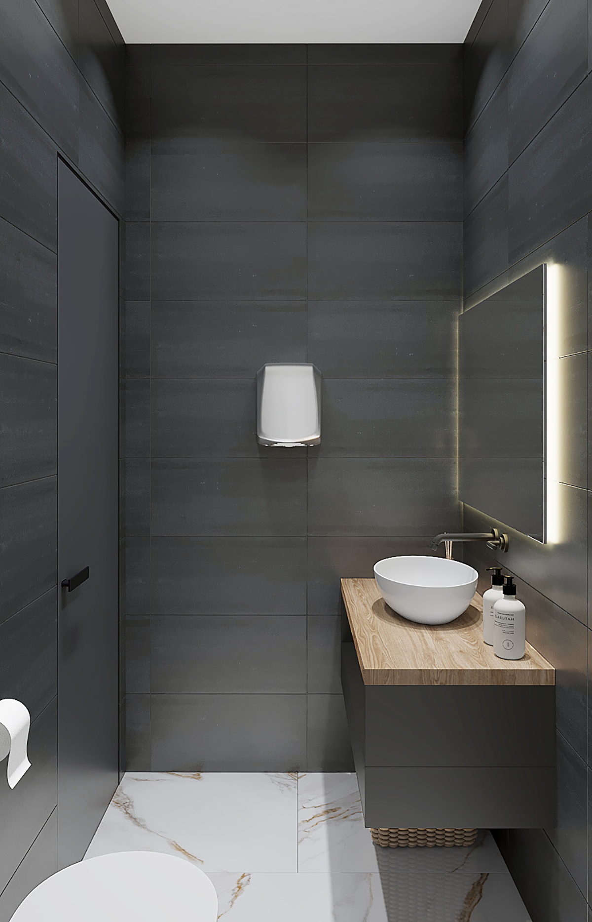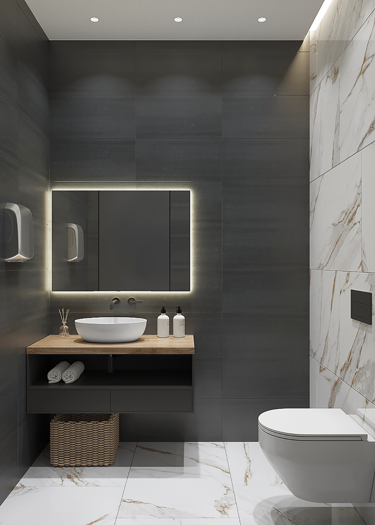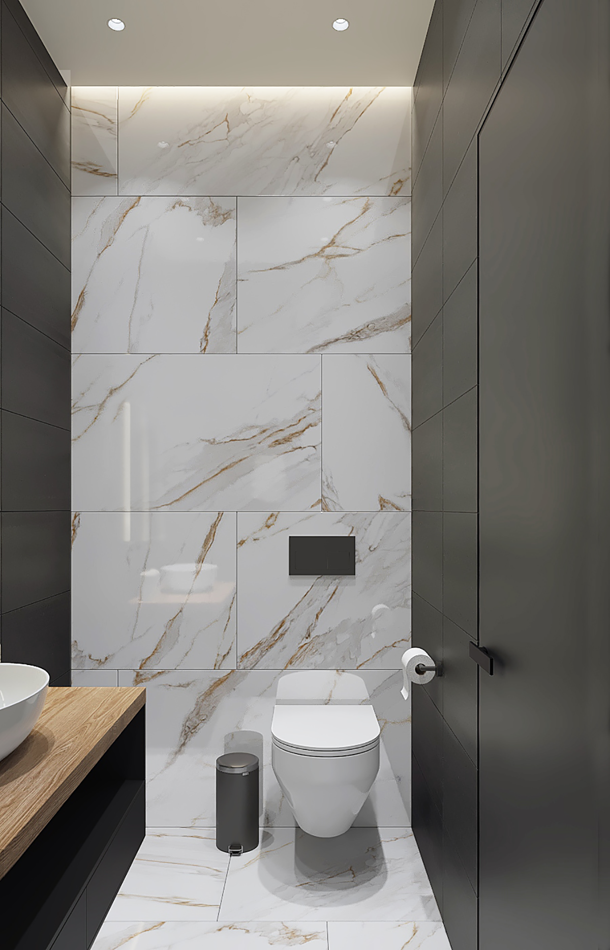 85 квадратных метров, на стенах керамогранит в сочетании с керамической плиткой, светлое просторное пространство, требующее акцентов.