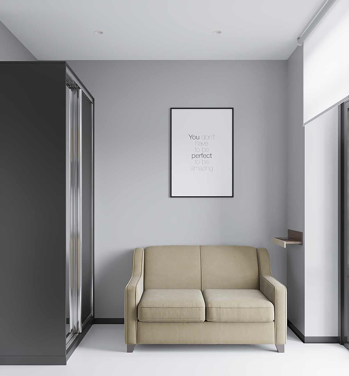 Создать уютную стоматологию, используя тёплую цветовую палитру – легко. А что, если разбить стереотипы и отдать предпочтение серым оттенкам и холодным тонам?